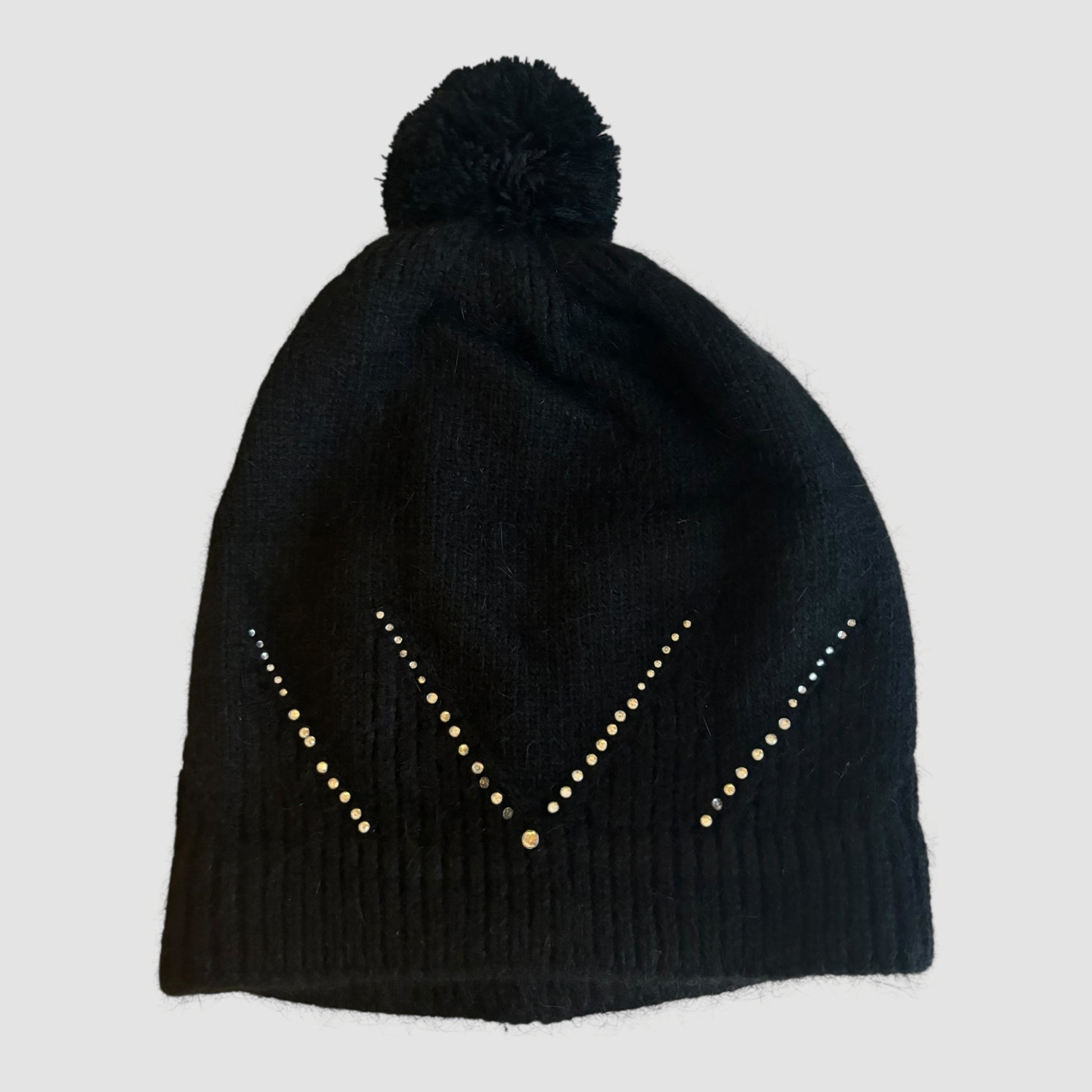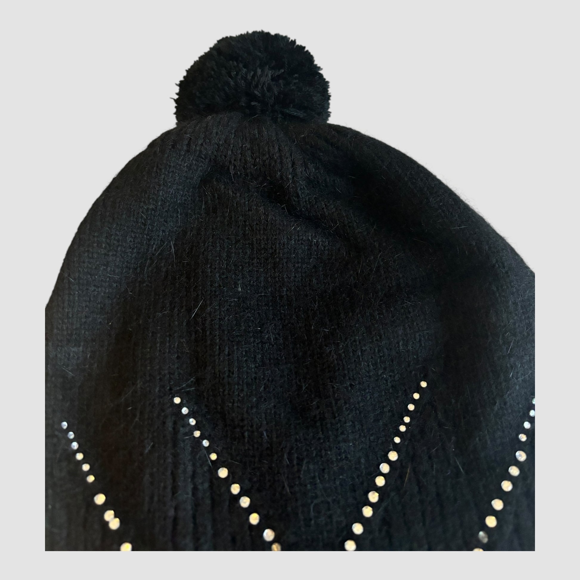 Gorro de malha preto com um pompom no topo e detalhes brilhantes.
